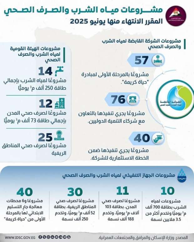 – 30 مشروعًا لصرف صحي المناطق الريفية، بطاقة 52 ألف متر مكعب وتخدم 250 ألف نسمة.